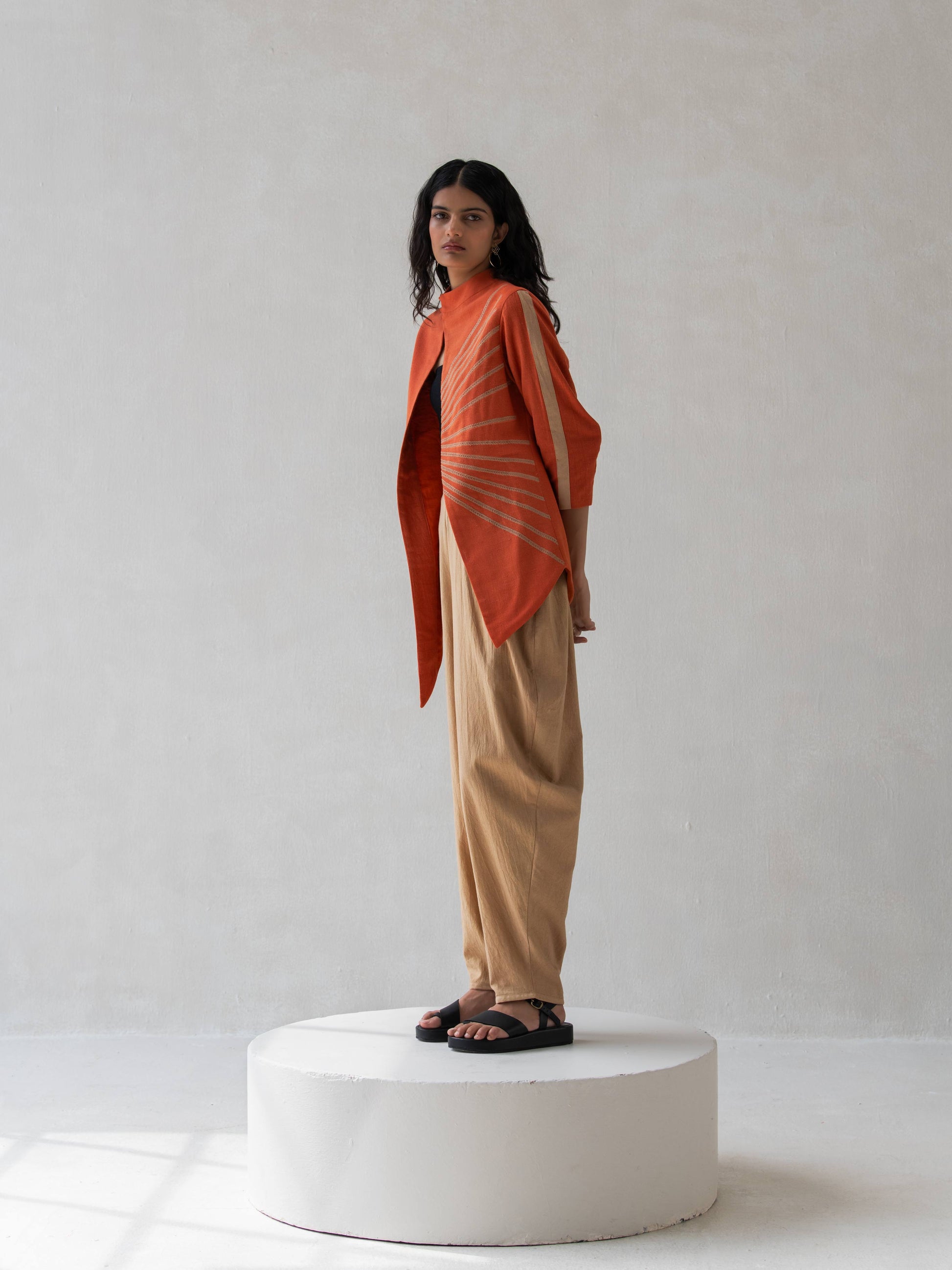 Crafted from organic kala cotton, these dark beige dhoti pants embody timeless elegance with a sustainable twist. The breathable, textured fabric offers a natural, airy feel, ensuring all-day comfort. The cowl silhouette creates a flattering, relaxed fit that adds movement and flow to every step. Designed for versatility, these pants transition effortlessly from day to night. Pair them with a fitted crop top or a breezy blouse for a casual-chic look, or style them with a structured jacket and bold accessories for an elevated ensemble. Whether for a relaxed outing or a special occasion, these dhoti pants make a conscious fashion statement with every wear.